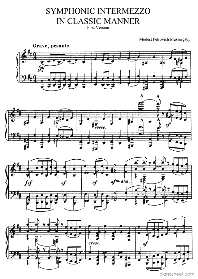 Piano sheet music downloads and recordings. This piece is by Modest Petrovich Mussorgsky: Intermezzo in the Classic Manner - First Version in B Minor (published in 1861) . Level 7, Period: Late Romantic