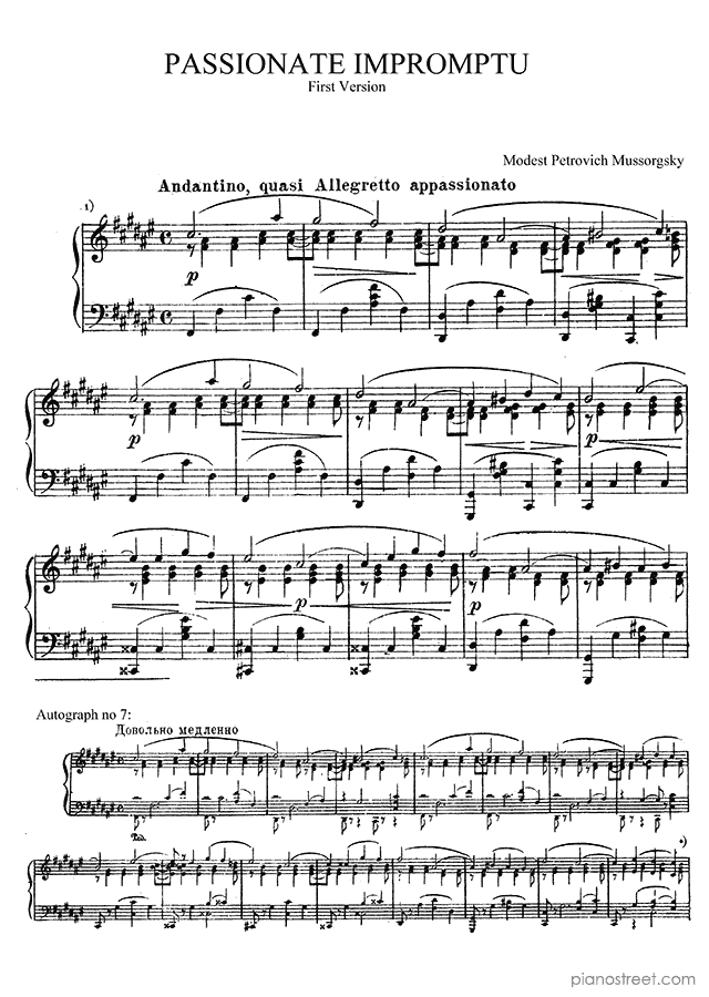 Passionate Impromptu - First Version in F-sharp Major by Modest Petrovich Mussorgsky. Sheet music and recordings of thousands of piano pieces by Modest Petrovich Mussorgsky and many other composers to view in digital devices, print or listen to.