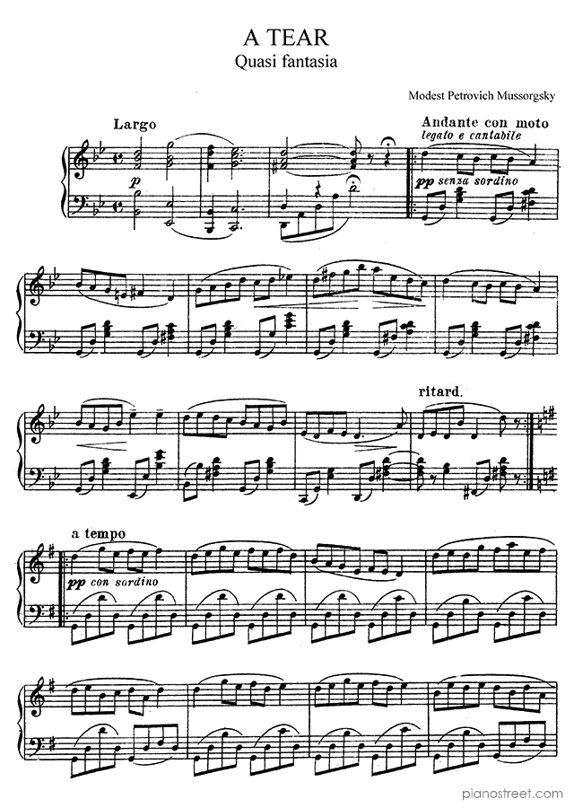 A Tear in G Minor - is a piano piece by the late romantic composer Modest Petrovich Mussorgsky who lived between the years 1839 and 1891.