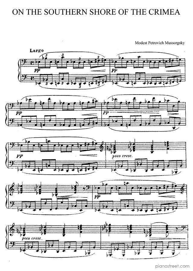 Mussorgsky: On the Southern Shore of the Crimea (published in 1880) . DOWNLOAD piano sheet music from Piano Street digital sheet music library.