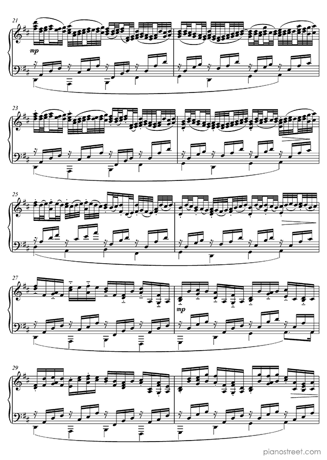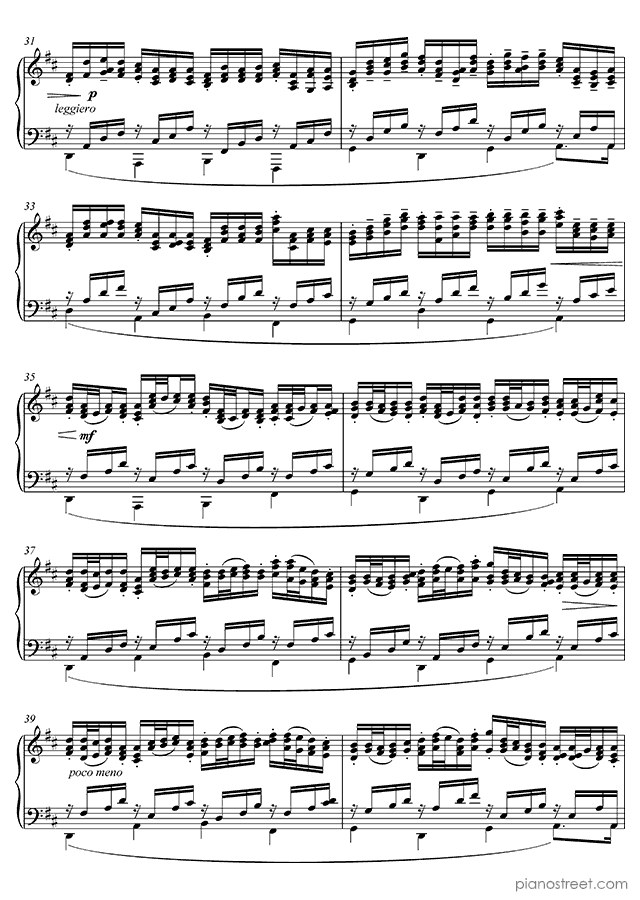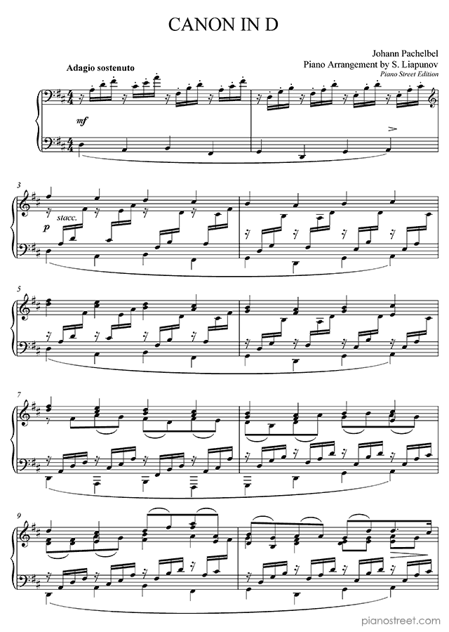 Pachelbel's Canon is built around a two-bar ostinato, which becomes the foundation for a set of 28 variations, in which the violins interact in canon with one another. Liapunov's version is an attempt to transcribe all three violin parts as faithfully as possible, plus adding a broken chord accompaniment in the left hand. The result is an advanced excercise in finger independence, chord and double note playing.Background