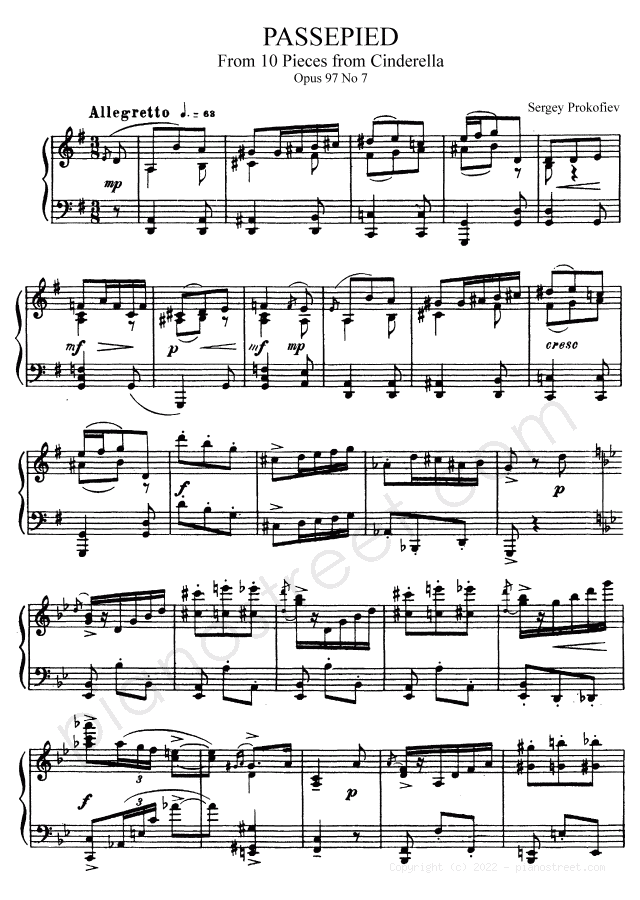 Passepied Op. 97 No. 7 in G Major (published in 1943) from Ten Pieces from Cinderella by Sergey Prokofiev - piano sheet music to download and print instantly.