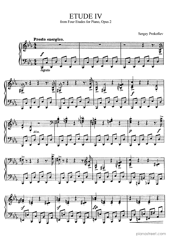 Etude in C Minor Op. 2 No. 4 by Sergey Prokofiev. Sheet music and recordings of thousands of piano pieces by Sergey Prokofiev and many other composers to view in digital devices, print or listen to.