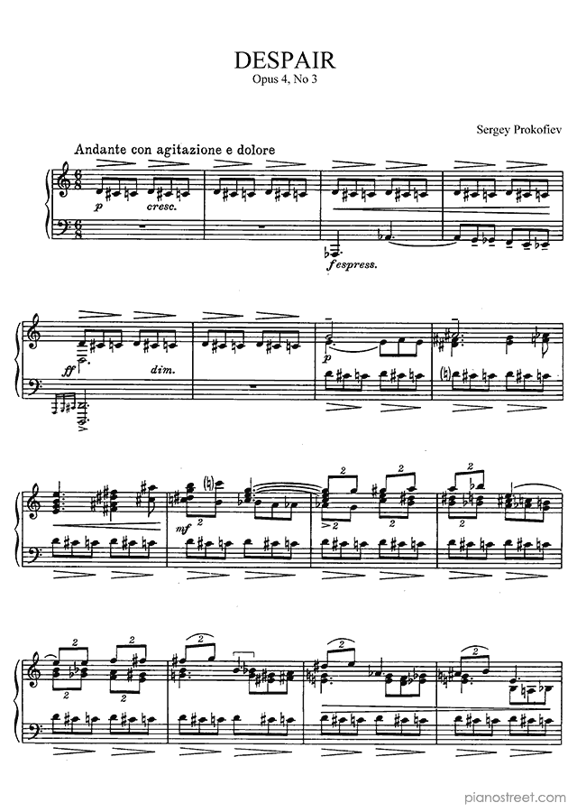 Piano sheet music downloads and recordings. This piece is from Four Pieces by Sergey Prokofiev: Despair Op. 4 No. 3 (published in 1912) . Level 8+, Period: Modern