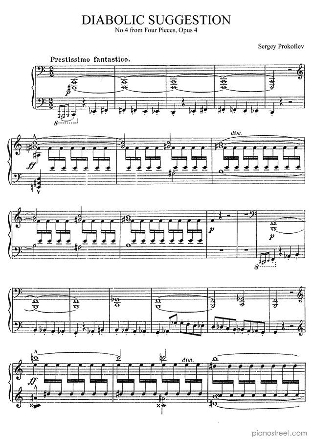 This piece is composed by Sergey Prokofiev and was published in 1912. Title: Diabolic Suggestion, Op. 4 No. 4 from Four Pieces. The difficulty level is around ABRSM grade 8+ and it belongs to the Modern period.