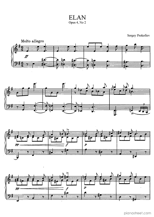 Modern piano sheet music by Sergey Prokofiev to download and print instantly: Elan Op. 4 No. 2 in the key of . Level 8, composition type: Piece (published in 1912)