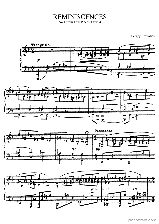 Reminiscences Op. 4 No. 1, a composition by the modern composer Sergey Prokofiev who was born in 1891 and died in 1953. The piano score of this piece was first published in 1912 and is part of Prokofiev's Four Pieces.
