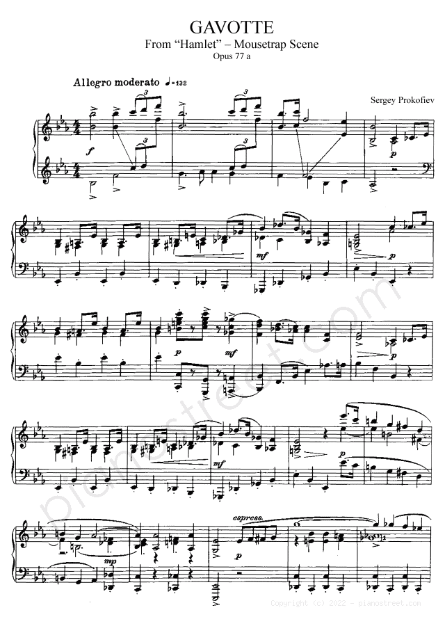Modern piano sheet music by Sergey Prokofiev to download and print instantly: Gavotte from Hamlet Op. 77 a in the key of . Level 8, compositional type: (published in 1938)