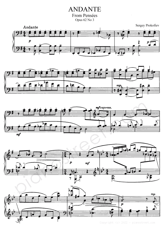 Andante Op. 62 No. 3 in E Minor (published in 1934) from Pensées by Sergey Prokofiev - piano sheet music to download and print instantly.