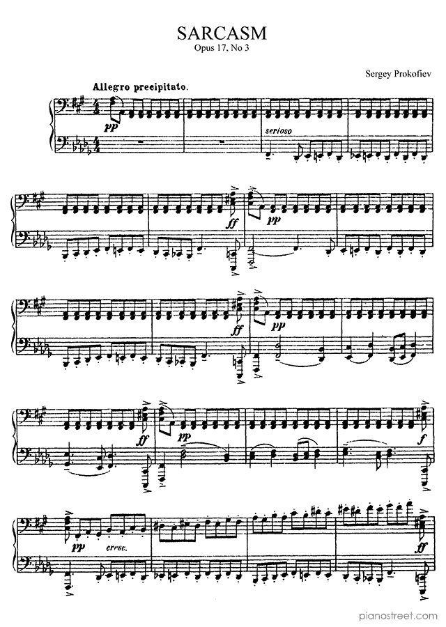 Sarcasm Op. 17 No. 3, a composition by the modern composer Sergey Prokofiev. The piano score of this piece was first published in 1914 and is part of Sarcasms by Prokofiev.