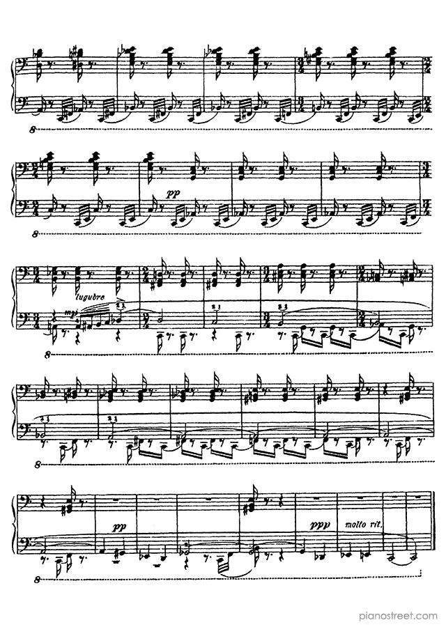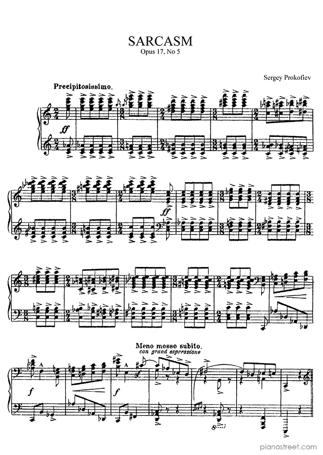 Modern piano sheet music by Sergey Prokofiev to download and print instantly: Sarcasm Op. 17 No. 5 in the key of . Level 8+, composition type: Piece (published in 1914)