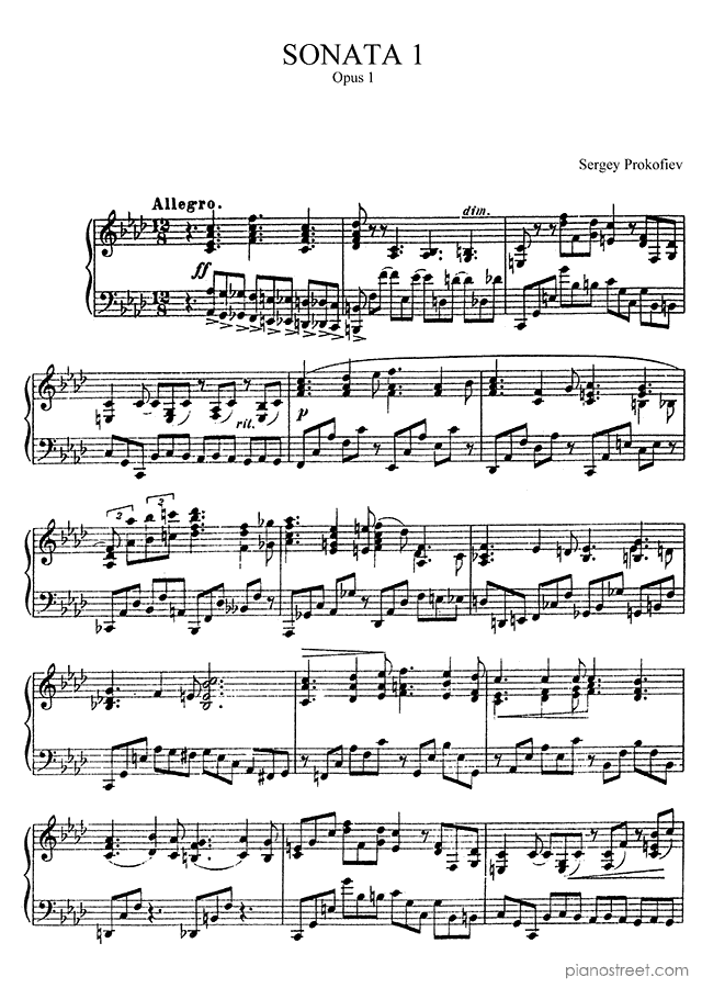 Modern piano sheet music by Sergey Prokofiev to download and print instantly: Sonata 1 Op. 1 in the key of . Level 8+, composition type: Sonata (published in 1909)