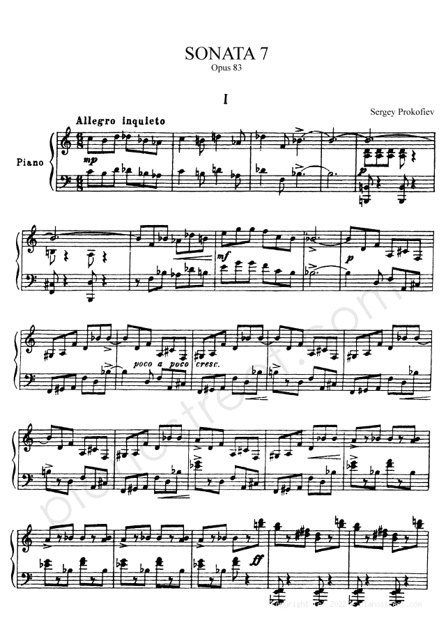 Piano sheet music and recordings. This piece is from Sonatas by Sergey Prokofiev: Sonata 7 Op. 83 in B-flat Major (published in 1942) . Level 8+, Period: Modern
