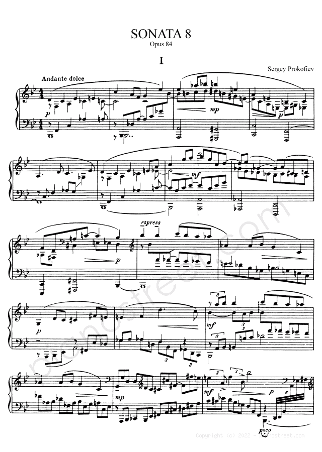 Sergey Prokofiev: Sonata 8 Op. 84 in B-flat Major from Sonatas - piano sheet music to print instantly. This piece is level 8+ and was composed during the Modern period.