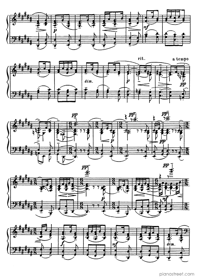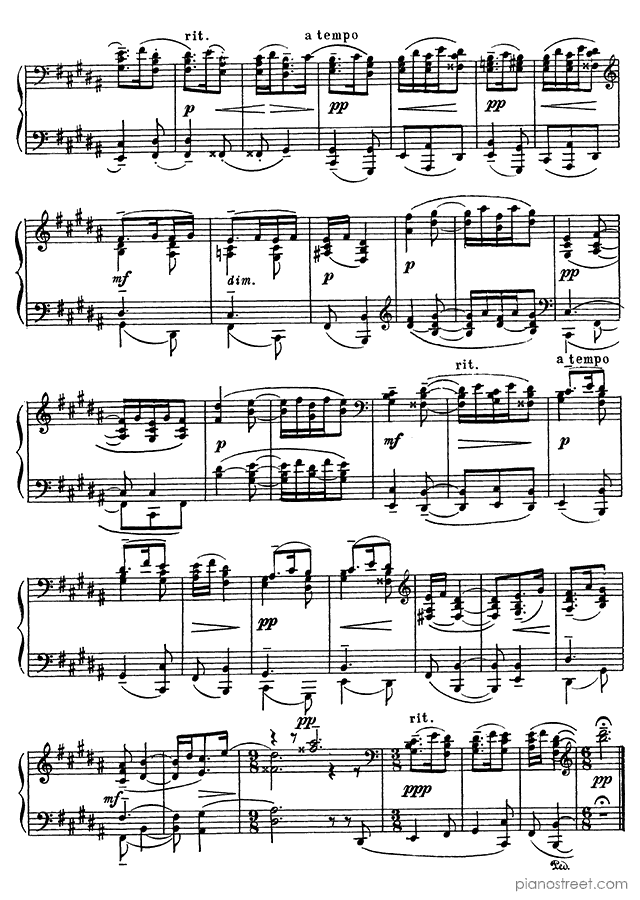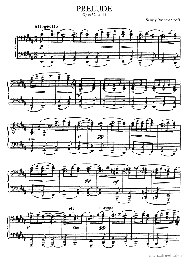 Sergey Rachmaninoff: Prelude Op. 32 No. 11 in B Major from 13 Preludes - piano sheet music to print instantly. This piece is level 8+ and was composed during the Late Romantic period.