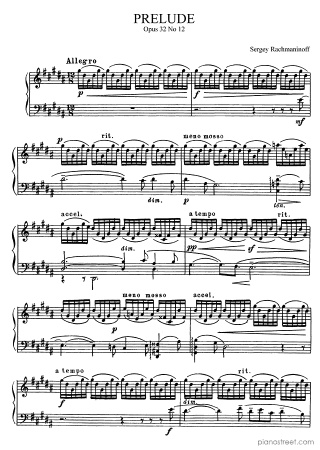 Prelude in G-sharp Minor Op. 32 No. 12 by the composer Sergey Rachmaninoff (1873-1943). This piece is from the Late Romantic era and is part of Rachmaninoff's 13 Preludes.