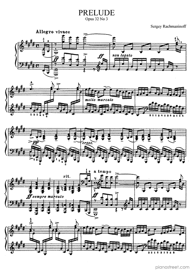 Prelude in E Major Op. 32 No. 3 by Sergey Rachmaninoff. Sheet music and recordings of thousands of piano pieces by Sergey Rachmaninoff and many other famous composers to view in your digital device, print out or listen to.