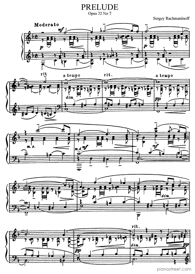 Prelude Op. 32 No. 7 in F Major, a composition by the late romantic composer Sergey Rachmaninoff. It was composed during the Late Romantic period and is part of 13 Preludes by Rachmaninoff.