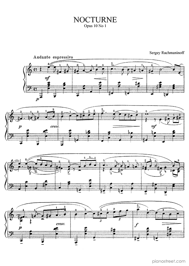 Nocturne in A Minor Op. 10 No. 1 by Sergey Rachmaninoff. Sheet music and recordings of thousands of piano pieces by Sergey Rachmaninoff and many other famous composers to view in your digital device, print out or listen to.