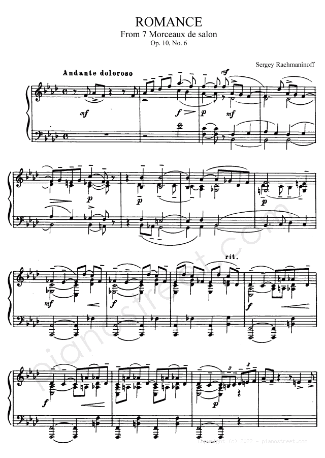 DOWNLOAD: Sergey Rachmaninoff - Romance Op. 10 No. 6 in F Minor ( from 7 Morceaux de salon by Rachmaninoff). Piano sheet music to print immediately or to view in mobile devices.