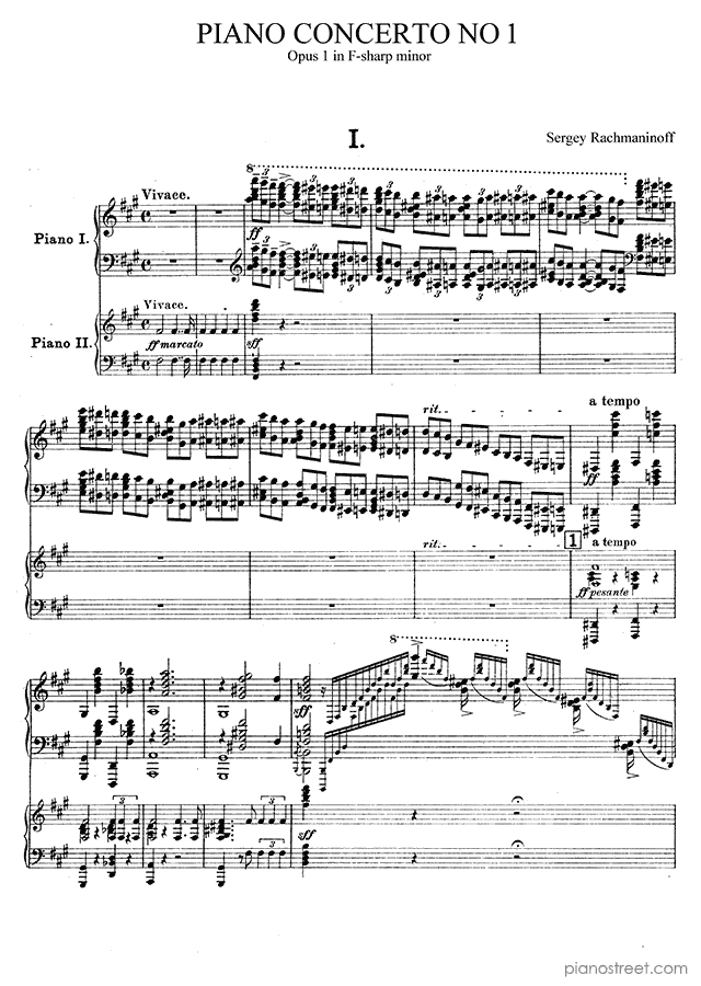 Sergey Rachmaninoff, who was one of the prominent composers active in the Late Romantic era, wrote this piece titled "Piano Concerto 1"Op. 1 in F-sharp Minor from Concertos. The composition is categorized as "Concerto" in the sheet music library and the level of difficulty in the piano music database is 8+.