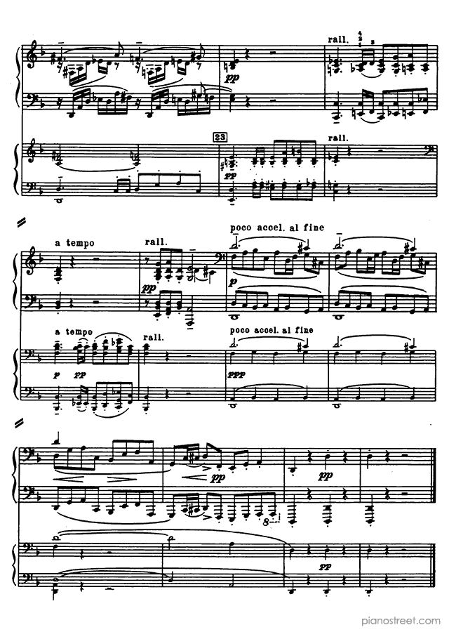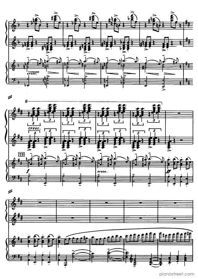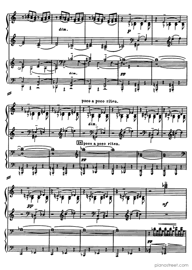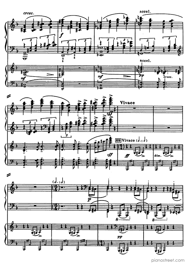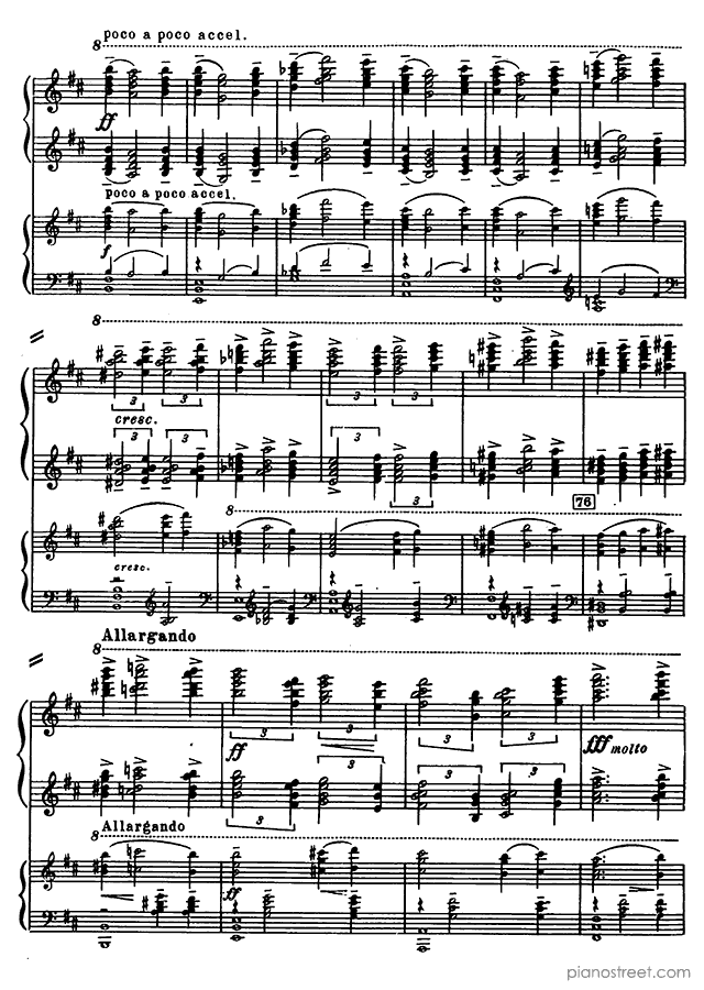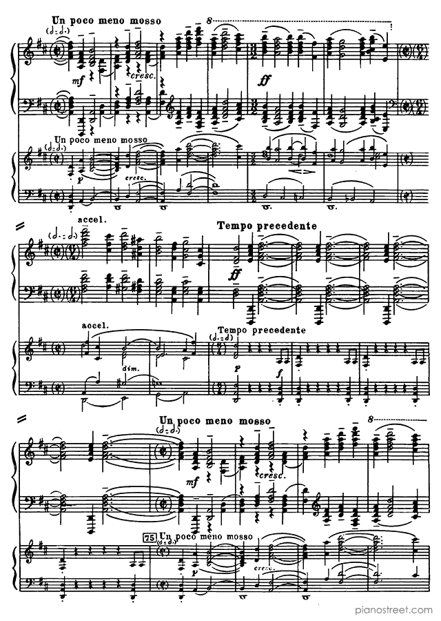 The piece ends with the four-note rhythm, sometimes interpreted as the composer's musical signature – "Rach-ma-ni-noff!" – because it is used in both the composer's Second Concerto and Second Symphony.