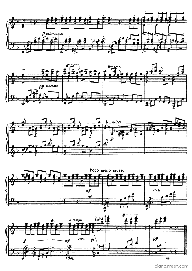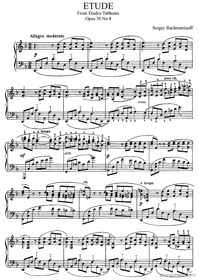 Sergey Rachmaninoff, who was one of the prominent composers active in the Late Romantic era, wrote this piece titled "Etude-Tableau: Allegro Moderato"Op. 39 No. 8 in D Minor from Etudes-Tableaux. The composition is categorized as "Study" in the sheet music library and the level of difficulty in the piano music database is 8+.