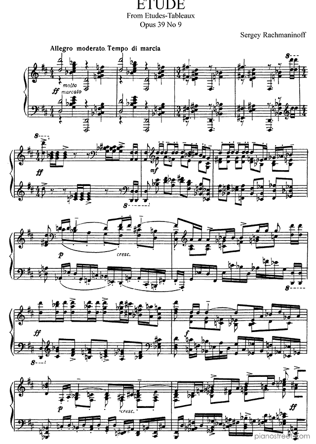 DOWNLOAD Etude-Tableau: Allegro Moderato in D Major Op. 39 No. 9 by Sergey Rachmaninoff. High quality classical piano scores from the Piano Street sheet music library.