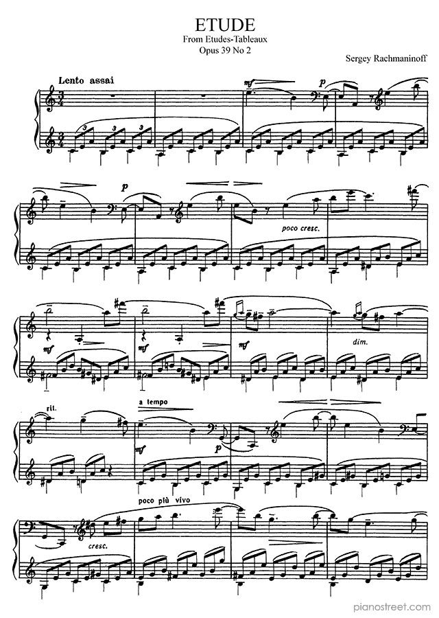 Late Romantic piano sheet music by Sergey Rachmaninoff to download and print instantly: Etude-Tableau: Lento Assai Op. 39 No. 2 in the key of . Level 8+, compositional type: Study