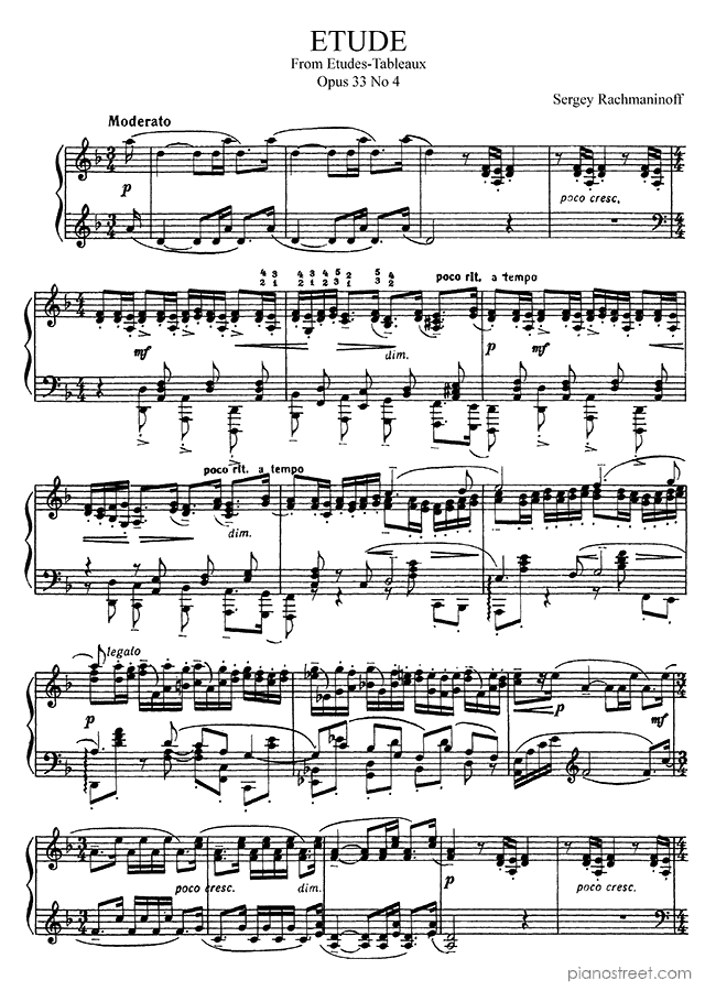 Etude-Tableau: Moderato Op. 33 No. 4 in D Minor, a composition by the late romantic composer Sergey Rachmaninoff. It was composed during the Late Romantic period and is part of Etudes-Tableaux by Rachmaninoff.