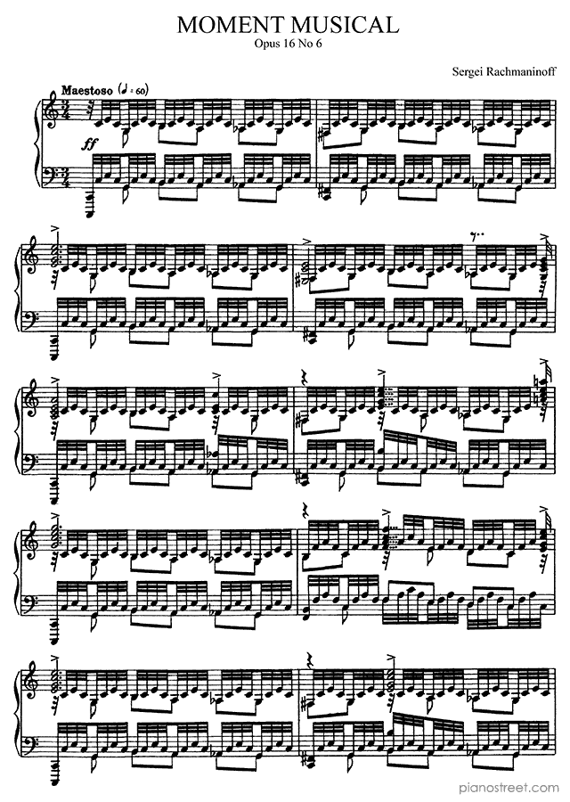 Sergey Rachmaninoff: Moment Musical Op. 16 No. 6 in C Major from Moments Musicaux - piano sheet music to print instantly. This piece is level 8+ and was composed during the Late Romantic period.