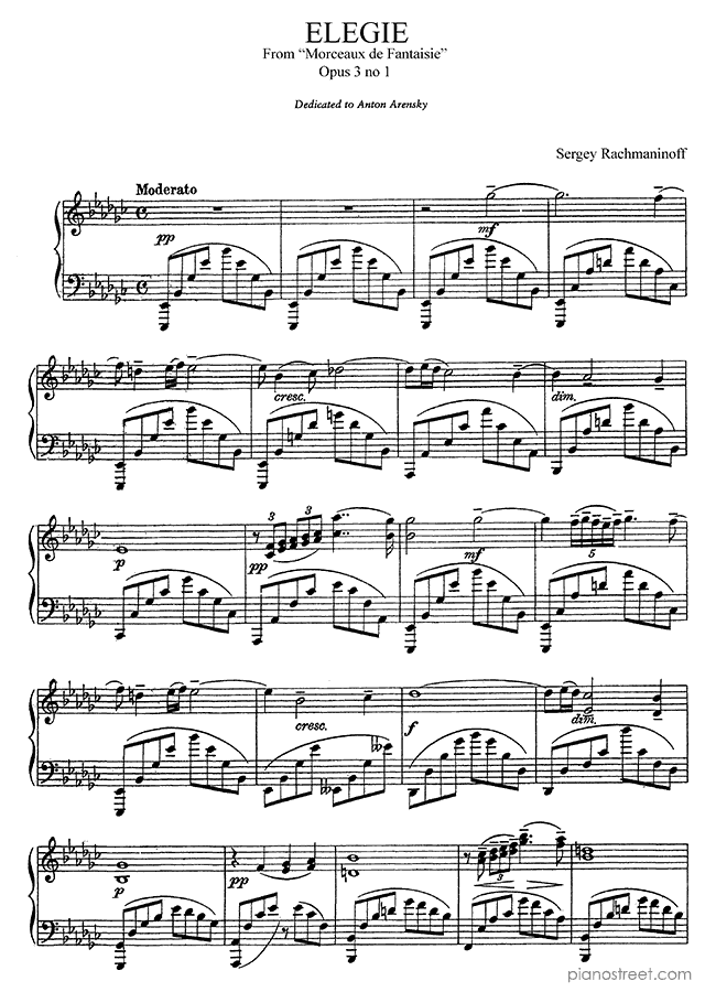 A heavy sense of pathos runs through the Élégie in E flat minor, underlining what is already suggested by its title – an elegy often serving as a lament for the dead. The quietly mournful beginning, with its lonely melody singing over left-hand arpeggios spanning multiple octaves, is evocative of the Nocturnes written by Chopin, whom Rachmaninoff admired. Nevertheless, the piece remains characteristically Rachmaninoffian throughout, with bell-like sonorities and a grand, distinctly Russian climax appearing during the middle of the piece.Though challenging, the piece is approachable for amateur pianists of some skill. A powerful interpretation makes full use of the dynamic contrasts between the piece’s different sections as well as between the right and left hand, as indicated by the composer.
