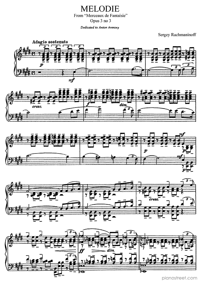 DOWNLOAD Mélodie in E Major Op. 3 No. 3 by Sergey Rachmaninoff (published in 1892) . High quality classical piano scores from the Piano Street sheet music library.