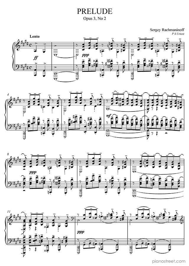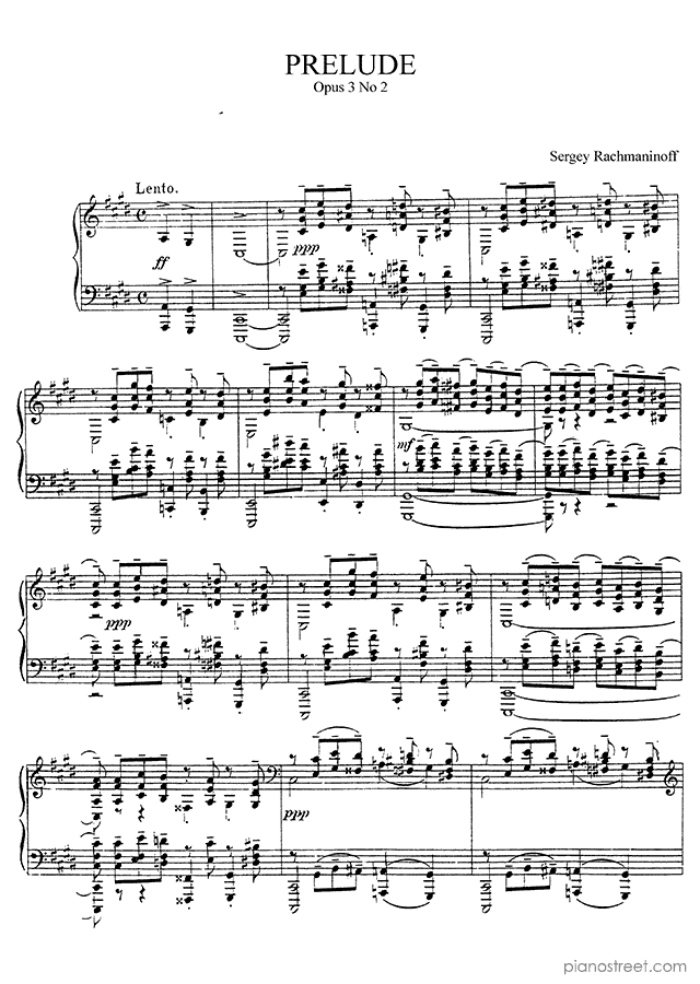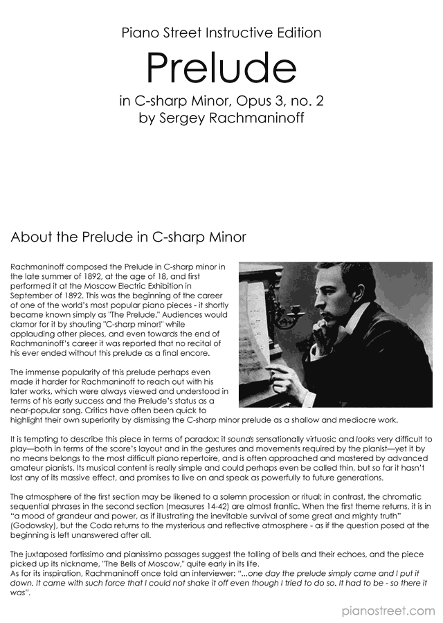 Rachmaninoff composed the Prelude in C-sharp minor in the late summer of 1892, at the age of 18, and first performed it at the Moscow Electric Exhibition in September of 1892. This was the beginning of the career of one of the world’s most popular piano pieces - it shortly became known simply as "The Prelude." Audiences would clamor for it by shouting "C-sharp minor!" while applauding other pieces, and even towards the end of Rachmaninoff’s career it was reported that no recital of his ever ended without this prelude as a final encore.Forum posts about this piece: