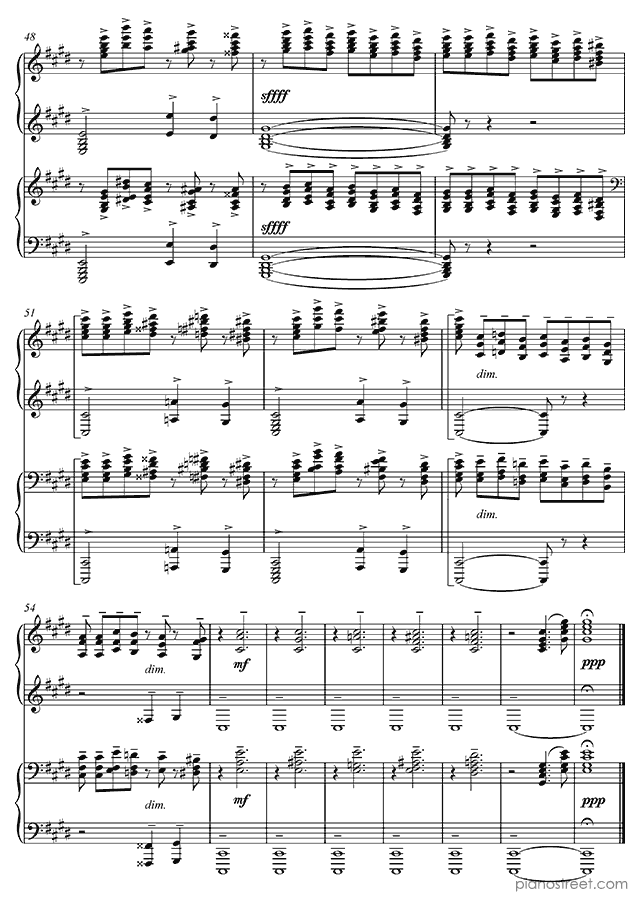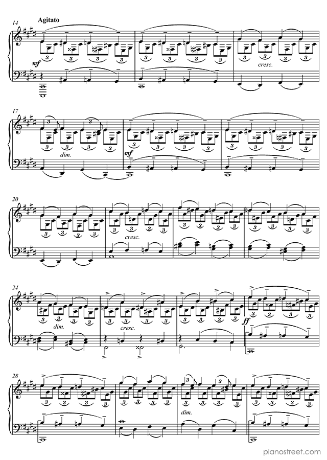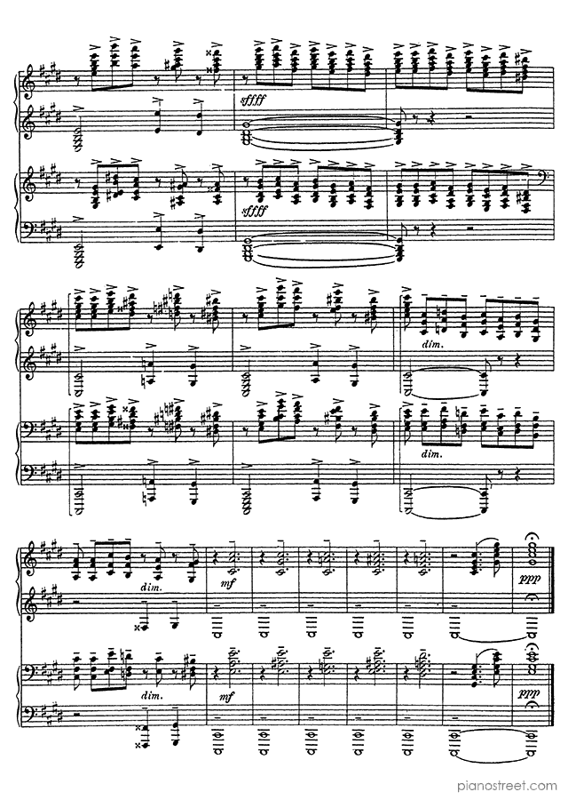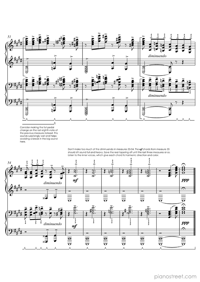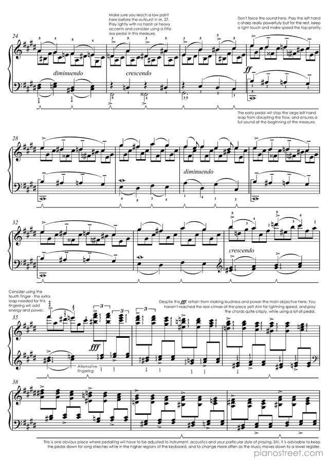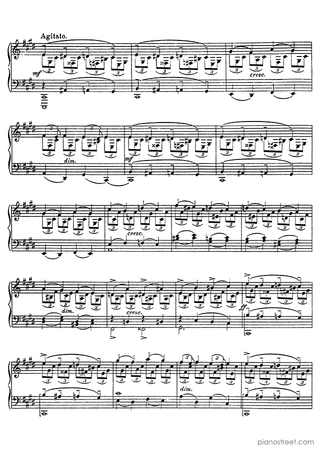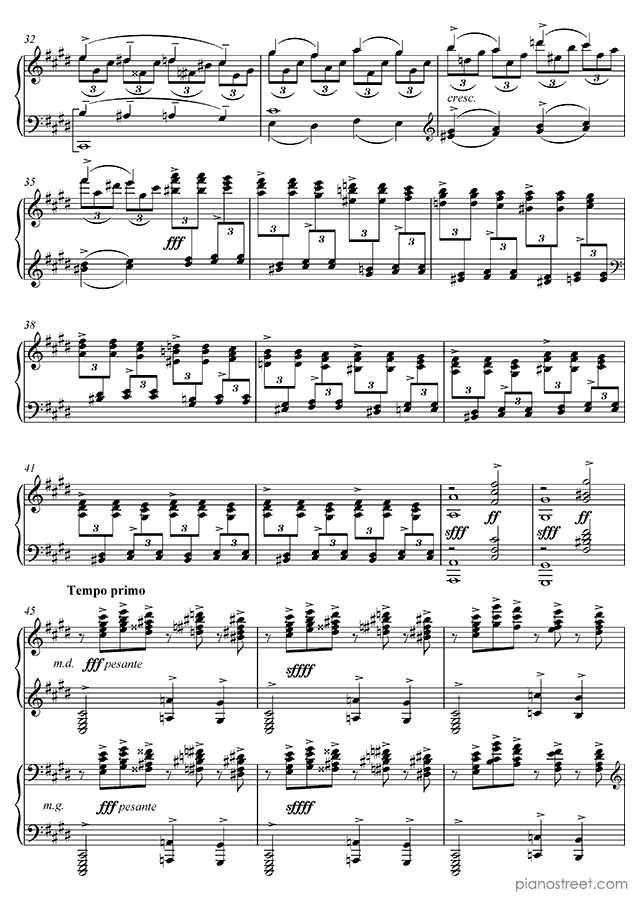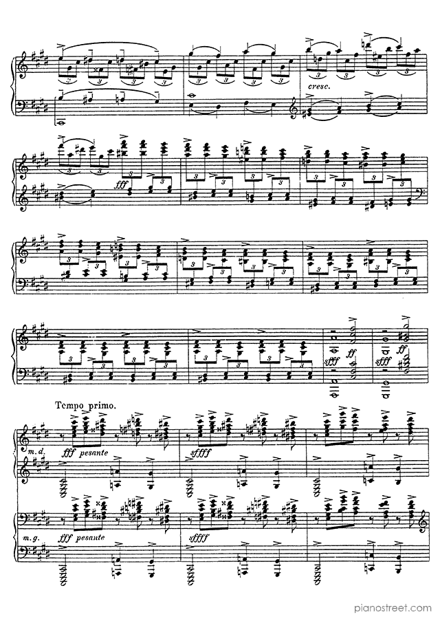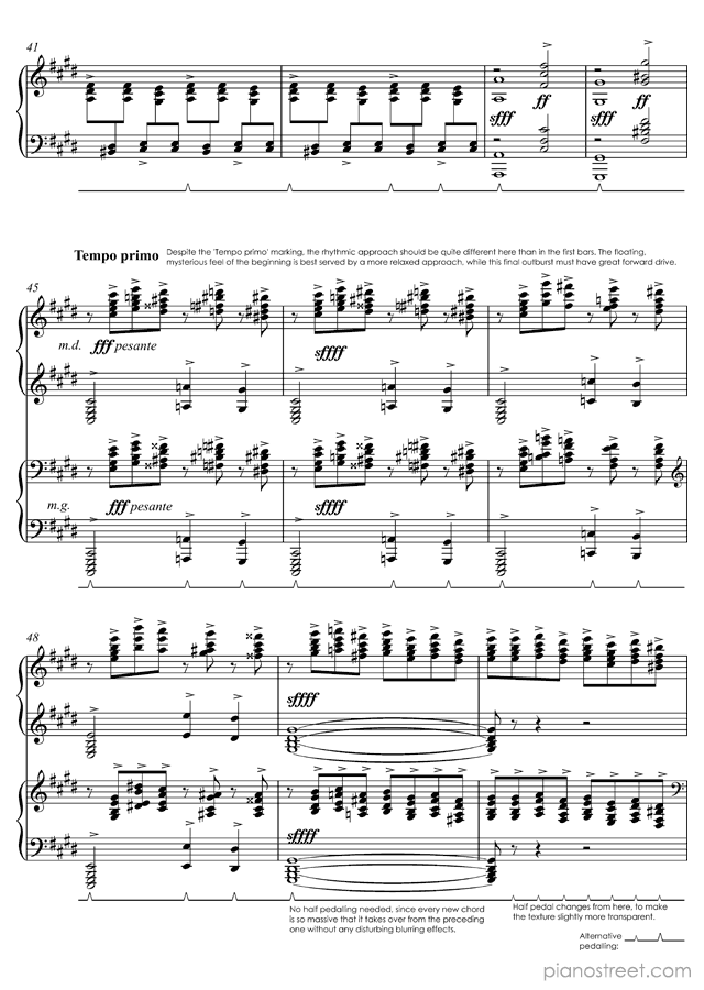It is tempting to describe this piece in terms of paradox: it sounds sensationally virtuosic and looks very difficult to play—both in terms of the score’s layout and in the gestures and movements required by the pianist—yet it by no means belongs to the most difficult piano repertoire, and is often approached and mastered by advanced amateur pianists. Its musical content is really simple and could perhaps even be called thin, but so far it hasn’t lost any of its massive effect, and promises to live on and speak as powerfully to future generations. The atmosphere of the first section may be likened to a solemn procession or ritual; in contrast, the chromatic sequential phrases in the second section (measures 14-42) are almost frantic. When the first theme returns, it is in “a mood of grandeur and power, as if illustrating the inevitable survival of some great and mighty truth” (Godowsky), but the Coda returns to the mysterious and reflective atmosphere - as if the question posed at the beginning is left unanswered after all.
