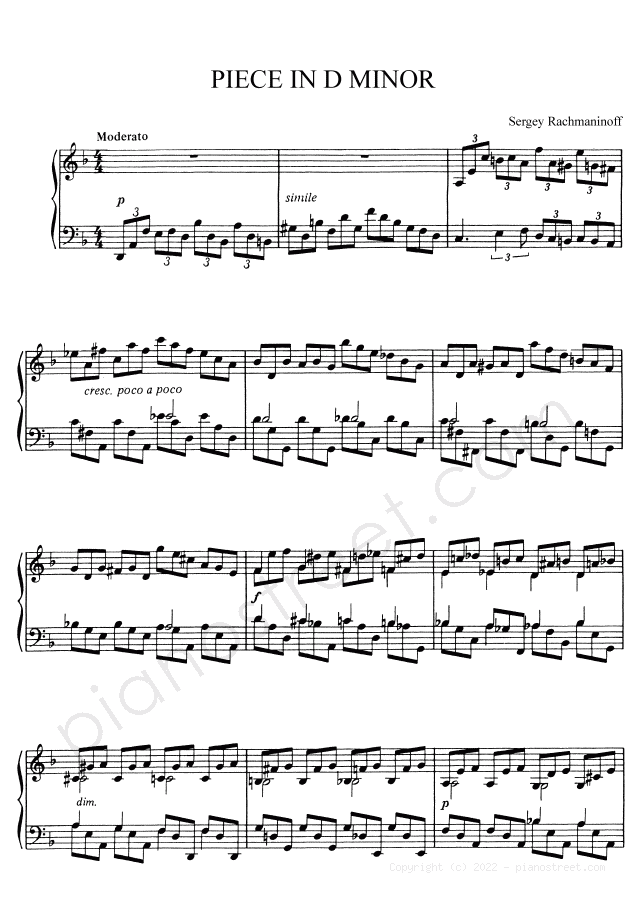 Piece (Fugue) in D Minor - is a piano piece by the late romantic composer Sergey Rachmaninoff who lived between the years 1873 and 1943.