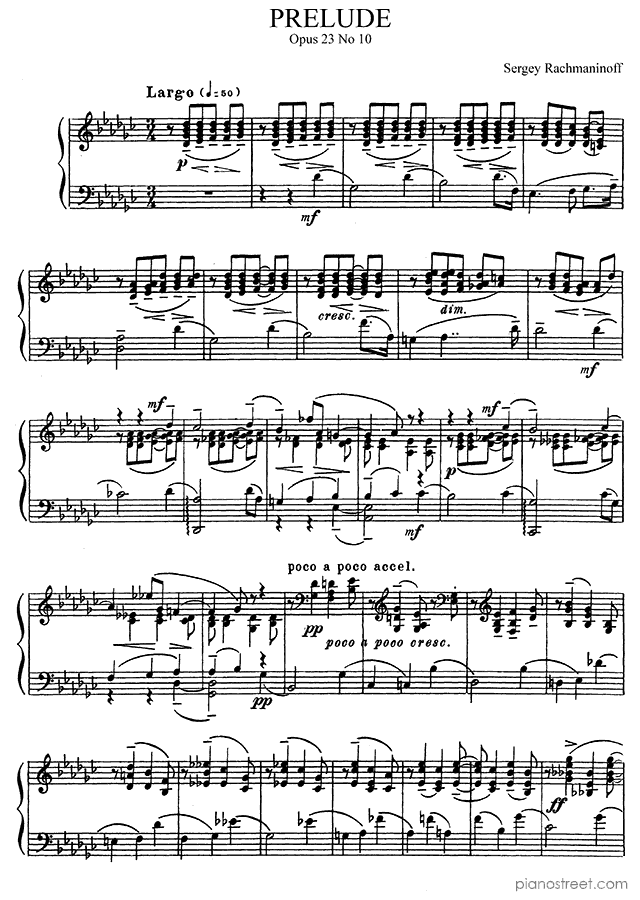 Piano sheet music and recordings. This piece is from Preludes by Sergey Rachmaninoff: Prelude Op. 23 No. 10 in G-flat Major . Level 8+, Period: Late Romantic