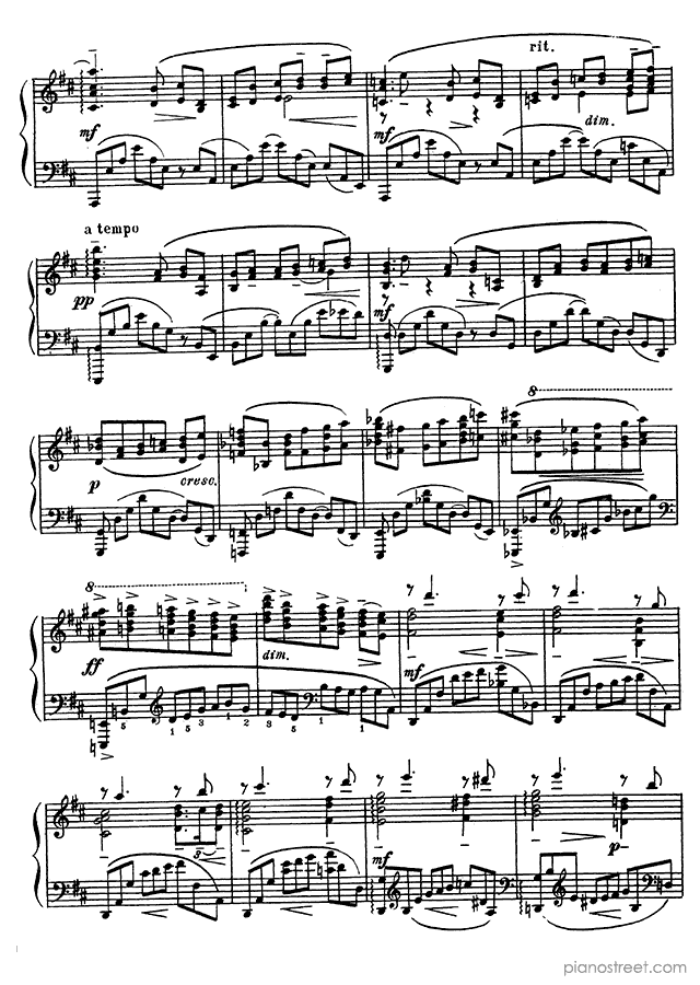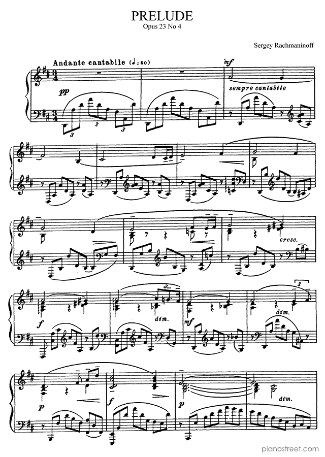 Sergey Rachmaninoff, who was one of the prominent composers active in the Late Romantic era, wrote this piece titled "Prelude"Op. 23 No. 4 in D Major from Preludes. The composition is categorized as "Piece" in the sheet music library and the level of difficulty in the piano music database is 8+.