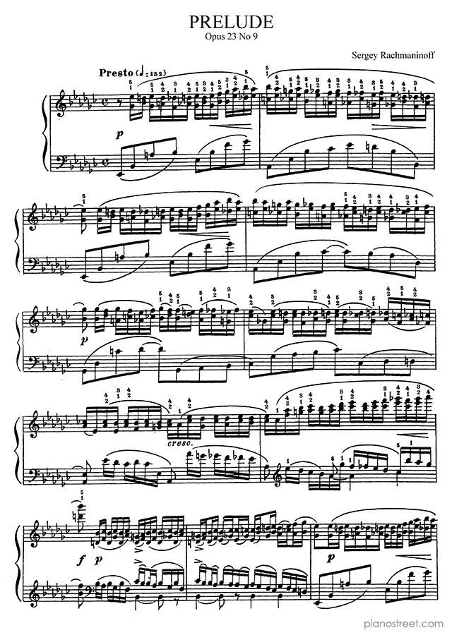 Late Romantic piano sheet music by Sergey Rachmaninoff to download and print instantly: Prelude Op. 23 No. 9 in the key of . Level 8+, compositional type: Piece