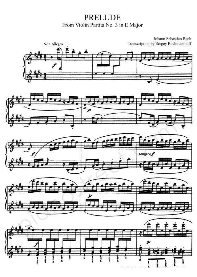 Bach: Prelude in E Major, a composition by the late romantic composer Sergey Rachmaninoff who was born in 1873 and died in 1943. The piano score of this piece was first published in 1933 and is part of Rachmaninoff's Transcriptions.