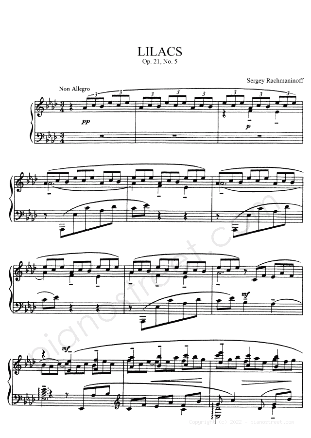 Late Romantic piano sheet music by Sergey Rachmaninoff to download and print instantly: Lilacs Op. 21 No. 5 in the key of . Level 8+, compositional type: Transcription (published in 1902)