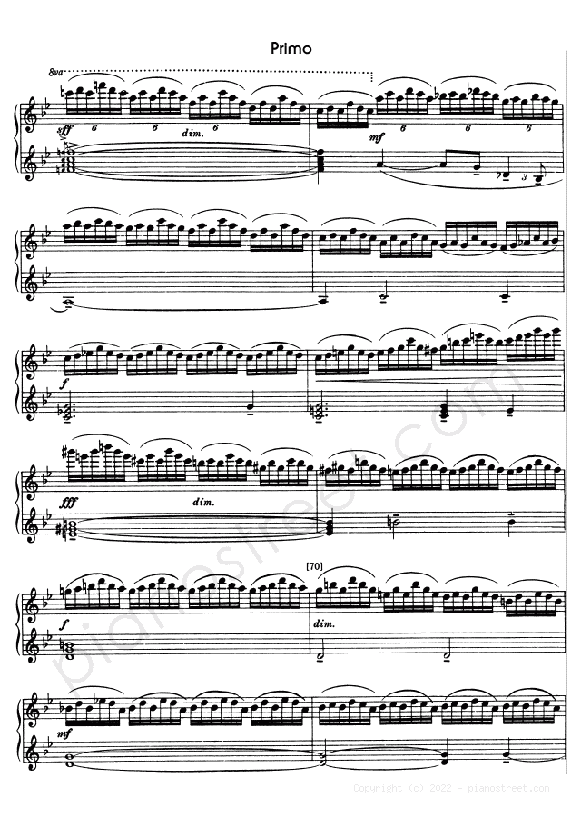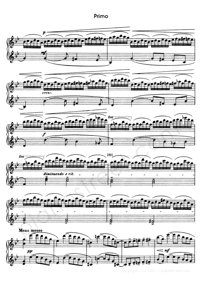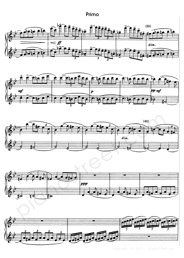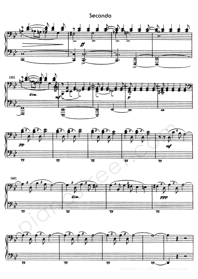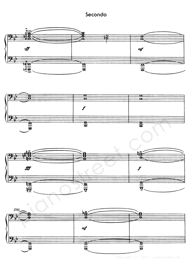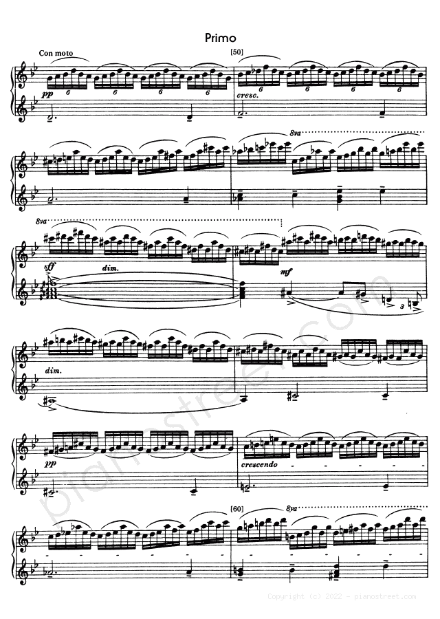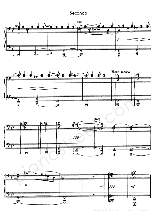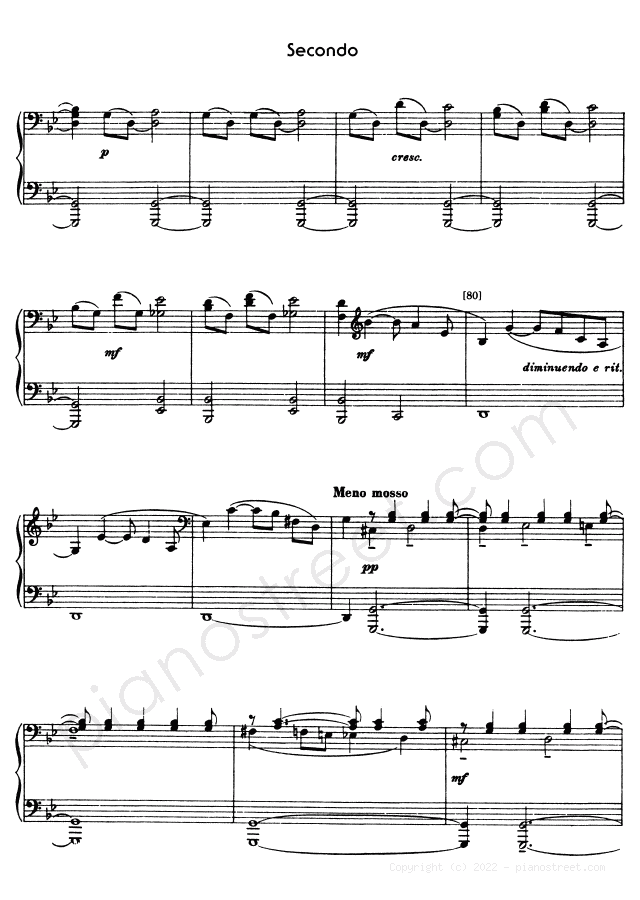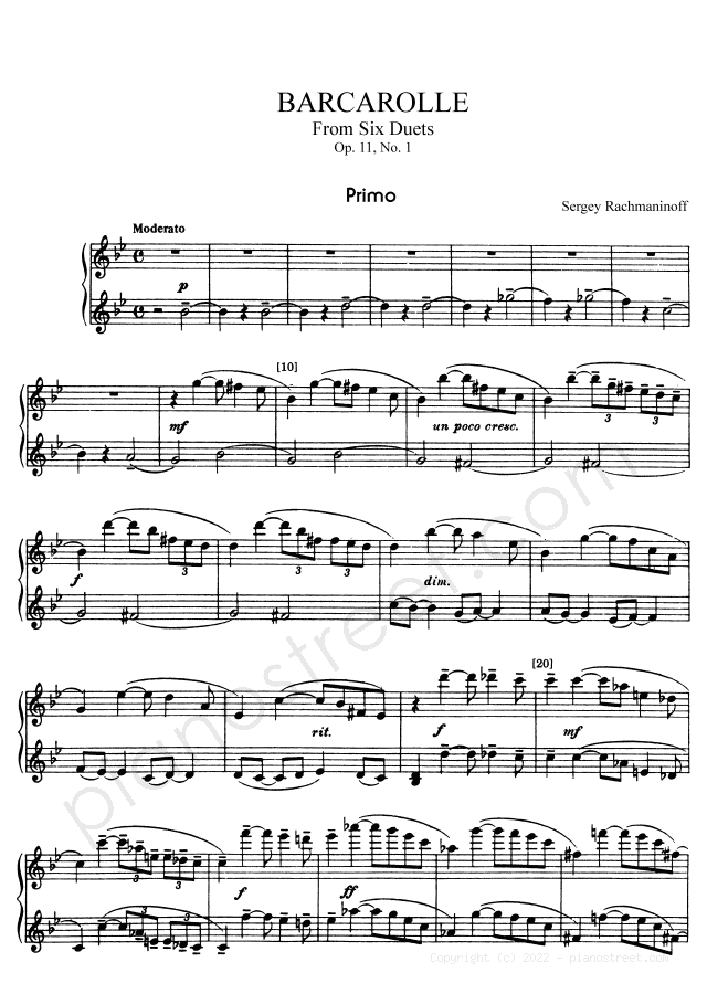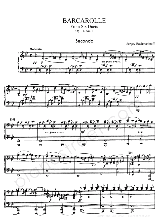 Sergey Rachmaninoff: 6 Duets: Barcarolle - for four hands Op. 11 No. 1 in G Minor from Works for four hands, six hands, and two pianos - piano sheet music to print instantly. This piece is level 8 and was composed during the Late Romantic period.