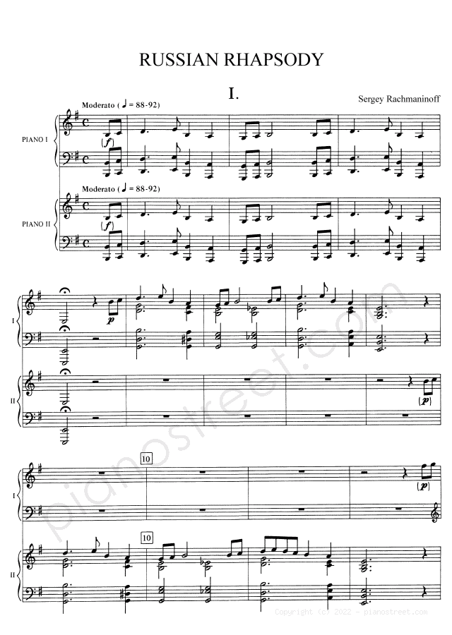 DOWNLOAD: Sergey Rachmaninoff - Russian Rhapsody - for two pianos in E Minor ( from Works for four hands, six hands, and two pianos by Rachmaninoff). Piano sheet music to print immediately or to view in mobile devices.