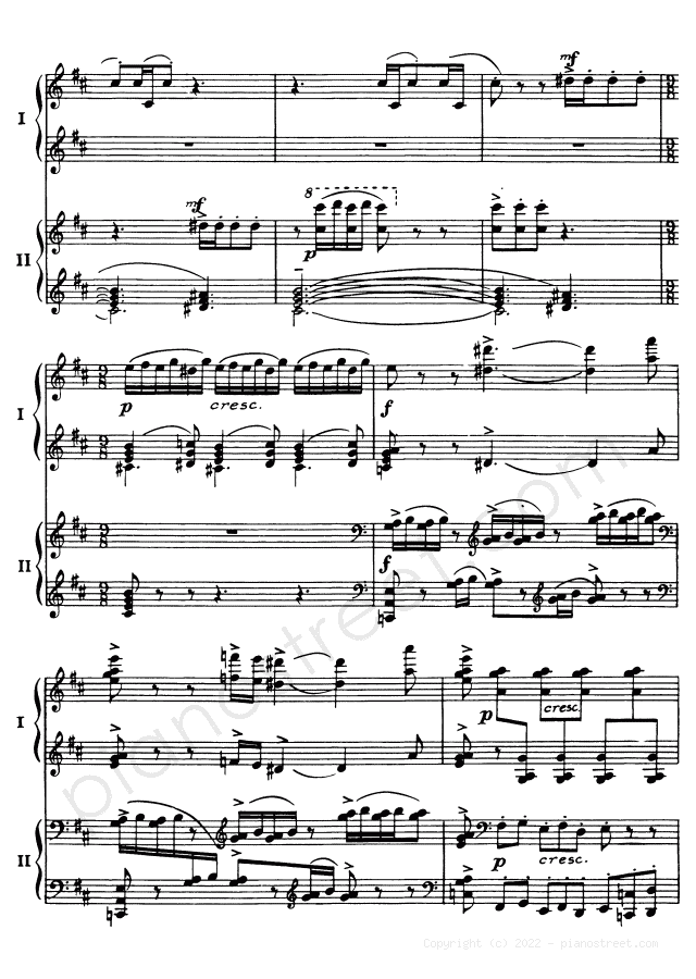 Sergey Rachmaninoff, one of the prominent composers active in the Late Romantic era, has written this piece titled Symphonic Dances - for two pianos Op. 45 from Works for four hands, six hands, and two pianos. The composition is categorized as "Suite, Two pianos" in Piano Street's sheet music library and the level of difficulty is 8+.