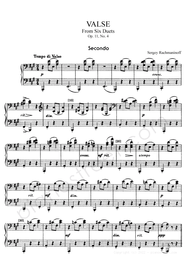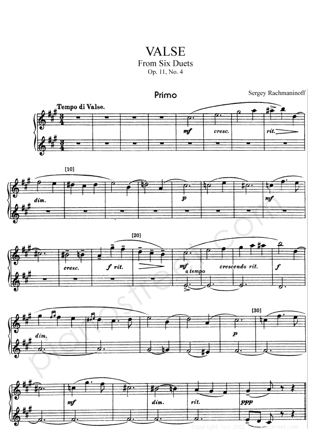6 Duets: Valse - for four hands in A Major - Op. 11 No. 4 is a piano piece by the late romantic composer Sergey Rachmaninoff who lived between the years 1873 and 1943.