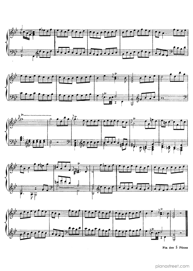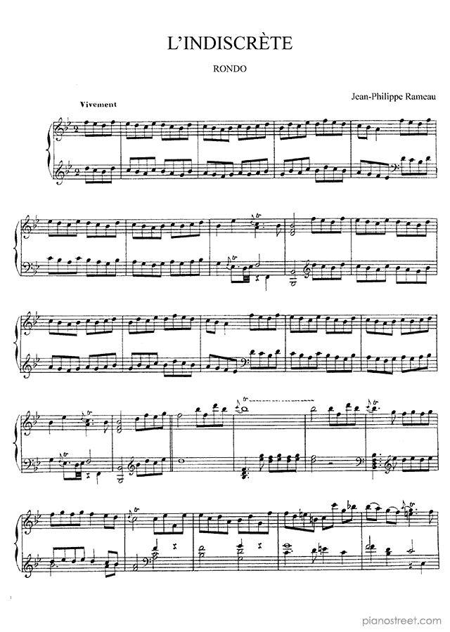Piano sheet music and recordings. This piece is from Concerted Pieces by Jean Philippe Rameau: The Indiscreet One No. 5 in B-flat Major (published in 1741) . Level 5, Period: Baroque
