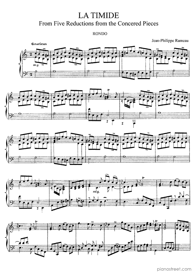 Baroque piano sheet music by Jean Philippe Rameau to download and print instantly: The Timid One, Rondo 1 No. 3 in the key of . Level 7, compositional type: Piece (published in 1741)