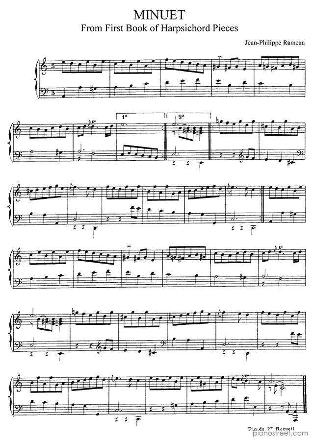 Downloadable piano sheet music from First Book of Harpsichord Pieces by Jean Philippe Rameau to print: Minuet No. 10 in A Minor (published in 1706)