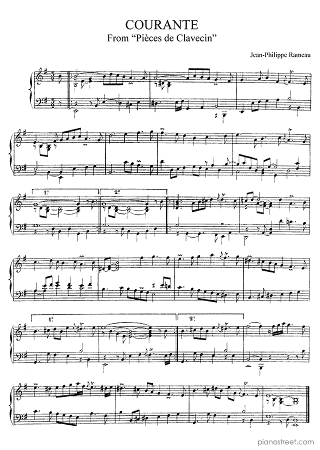 Baroque piano sheet music by Jean Philippe Rameau to download and print instantly: Courante No. 3 in the key of . Level 5, compositional type: Piece (published in 1724)
