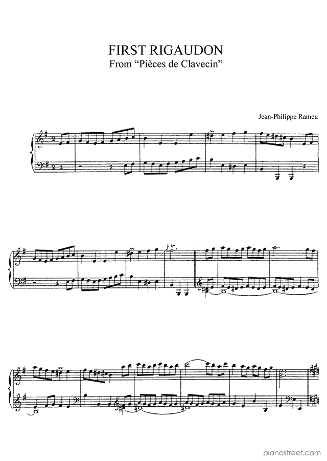 First Rigaudon in E Minor No. 7 by Jean Philippe Rameau. Sheet music and recordings of thousands of piano pieces by Jean Philippe Rameau and many other famous composers to view in your digital device, print out or listen to.